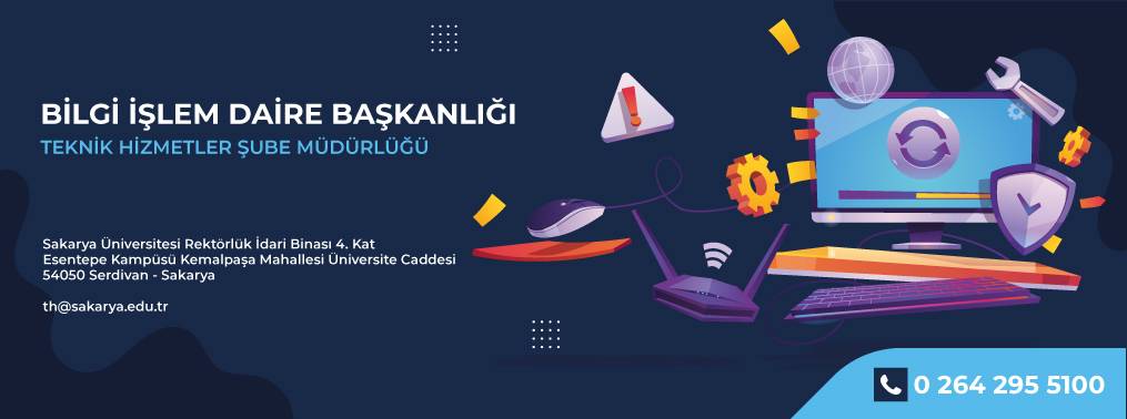 Teknik Hizmetler Şube Müdürlüğü, Genel Sekreterliğe bağlı olarak Bilgi İşlem Daire Başkanlığı bünyesinde Rektörlük İdari binasının 4. katında hizmet vermektedir. Hizmetlerimiz; Üniversite personelinden gelen teknik destek taleplerini karşılamak; yerinde servis hizmetleri, uzaktan erişim araçları ve birime talep etme şeklinde sorunlara müdahale etmek ve çözüm üretmek.Daire Başkanlığı'na resmi kanallarla (talep formu, EBYS vb.) iletilen ve üniversite envanterine (Taşınır Mal Yönetmeliği) kayıtlı olan akademik/idari personel, laboratuvar ve sınıf bilgisayarları ile çevre birimlerinin yazılımsal kurulum, yapılandırma, güncelleme ve donanımsal onarım işlemlerini yürütmek.Bilişim ürünleri satınalma aşamasında ihtiyaçlar doğrultusunda ürünlerin tespiti hususunda destek vermek.Garanti kapsamındaki arızalı cihazların, Daire Başkanlığı kayıtları esas alınarak, yetkili servislere iletilmek amacıyla ürün teslimata yönlendirmek ve gerekli kayıtları TSP kayıtlarına eklemek.Kullanım ömrünü tamamlayan bilişim donanımlarının hurdaya ayrılma işlemlerini, Şube Müdürünün yönlendirmeleri doğrultusunda, ilgili resmi envanter (TSP) kayıtlarıyla eşleştirerek ve prosedürlere uygun şekilde tamamlamak. Birimimize gelen bilişim ürünleriniz ile ilgili bilgi alabilmek amacıyla 5104’ü arayabilirsiniz.Bilişim ürünlerinizle ilgili destek alabilmek amacıyla 5128’i arayabilirsiniz.   Laboratuvar bakım formunu Sakarya Üniversitesi EBYS sistemi üzerinden yapılmaktadır. Sabis Kullanıcı Adı ve Şifreniz ile giriş yaparak; İş Akışları  >  Laboratuvar Bakım Talebi  >  Gerekli alanları doldurarak formu gönderebilirsiniz.